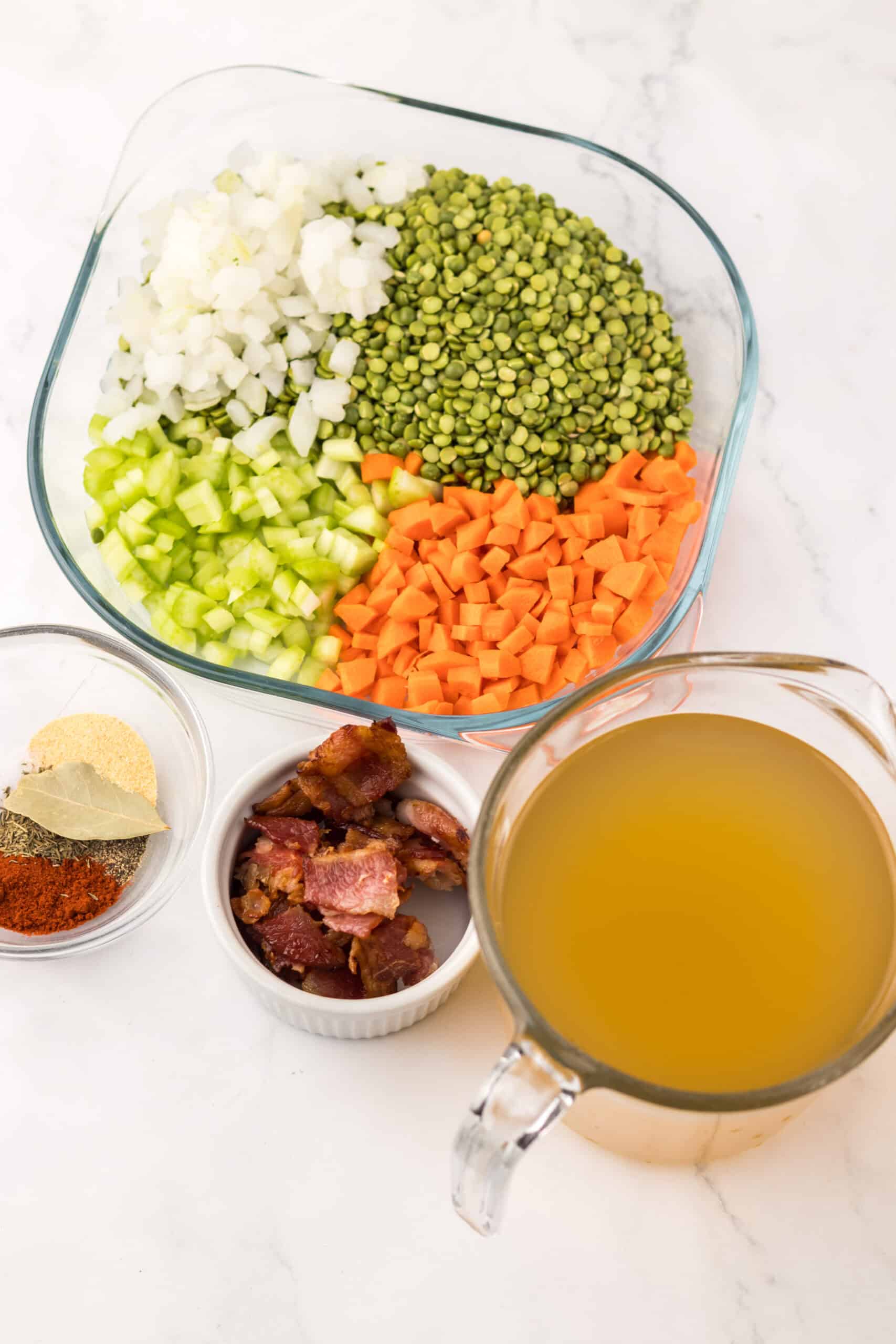 Step 2: Add the split peas to your slow cooker, then layer in the veggies, seasonings, cooked bacon, broth, water, and vinegar. Give it a quick stir so everything settles in.