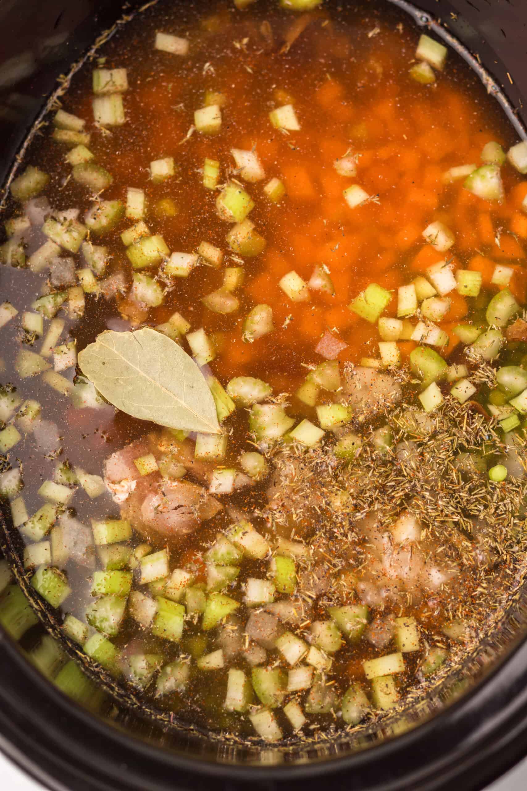 Add split peas to the bottom of the slow cooker. Top with the vegetables, half of the cooked bacon, garlic powder, salt, pepper, smoked paprika, thyme, and bay leaf. Pour in chicken broth, water, and vinegar.