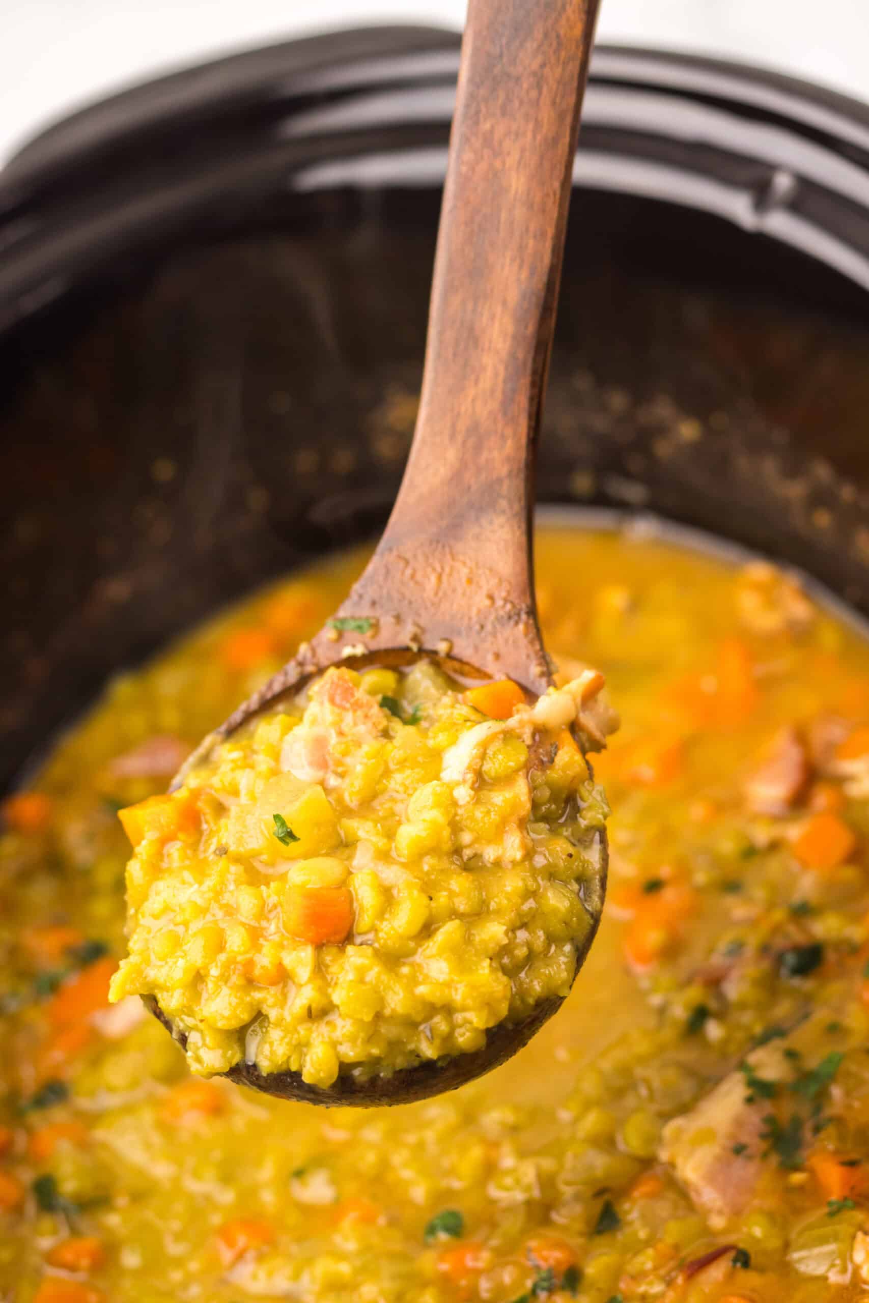 A creamy and cozy slow cooker split pea soup made with bacon, veggies, and simple ingredients. So comforting and perfect for cold nights.