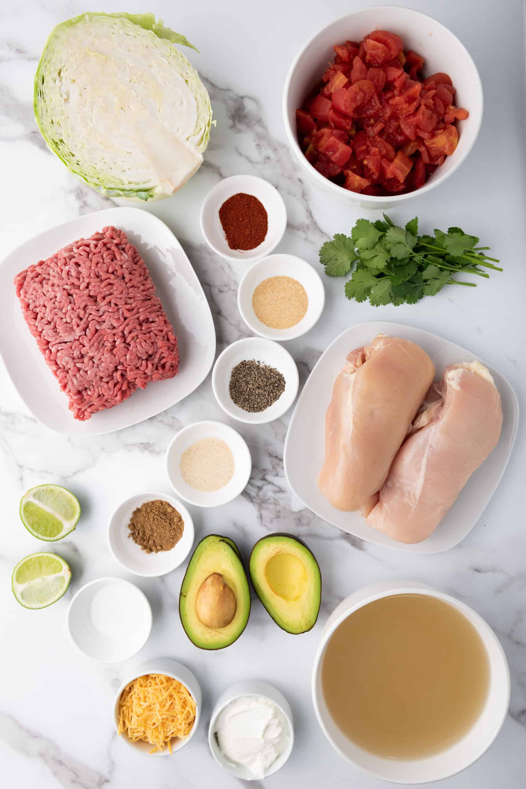Step 3: Add the chicken breasts, meatballs, diced tomatoes, cabbage, all the seasonings, and chicken stock to the slow cooker. Stir lightly to combine.