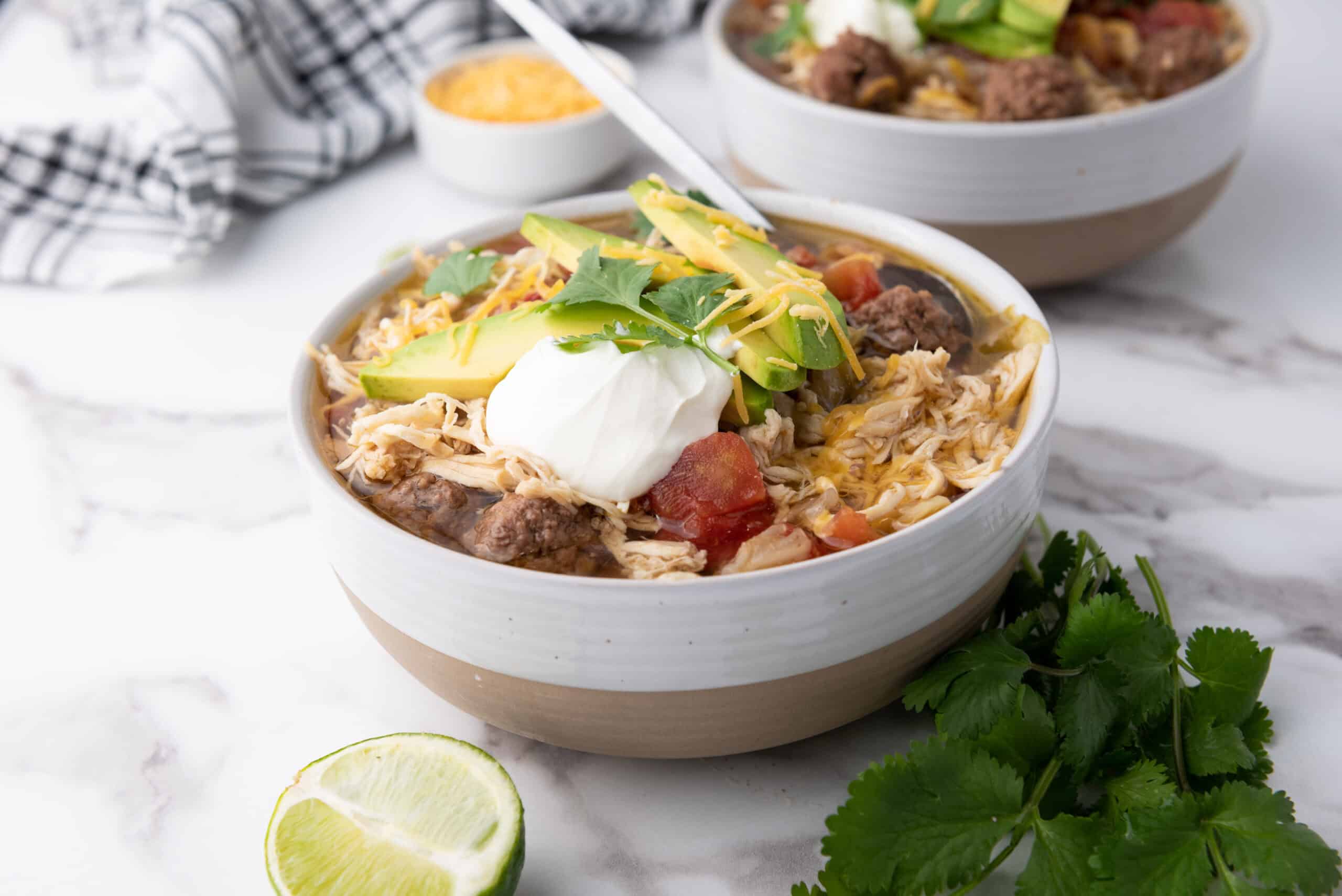 Step 5: Ladle the soup into bowls and top with avocado slices, sour cream, shredded cheese, lime juice, and fresh cilantro.