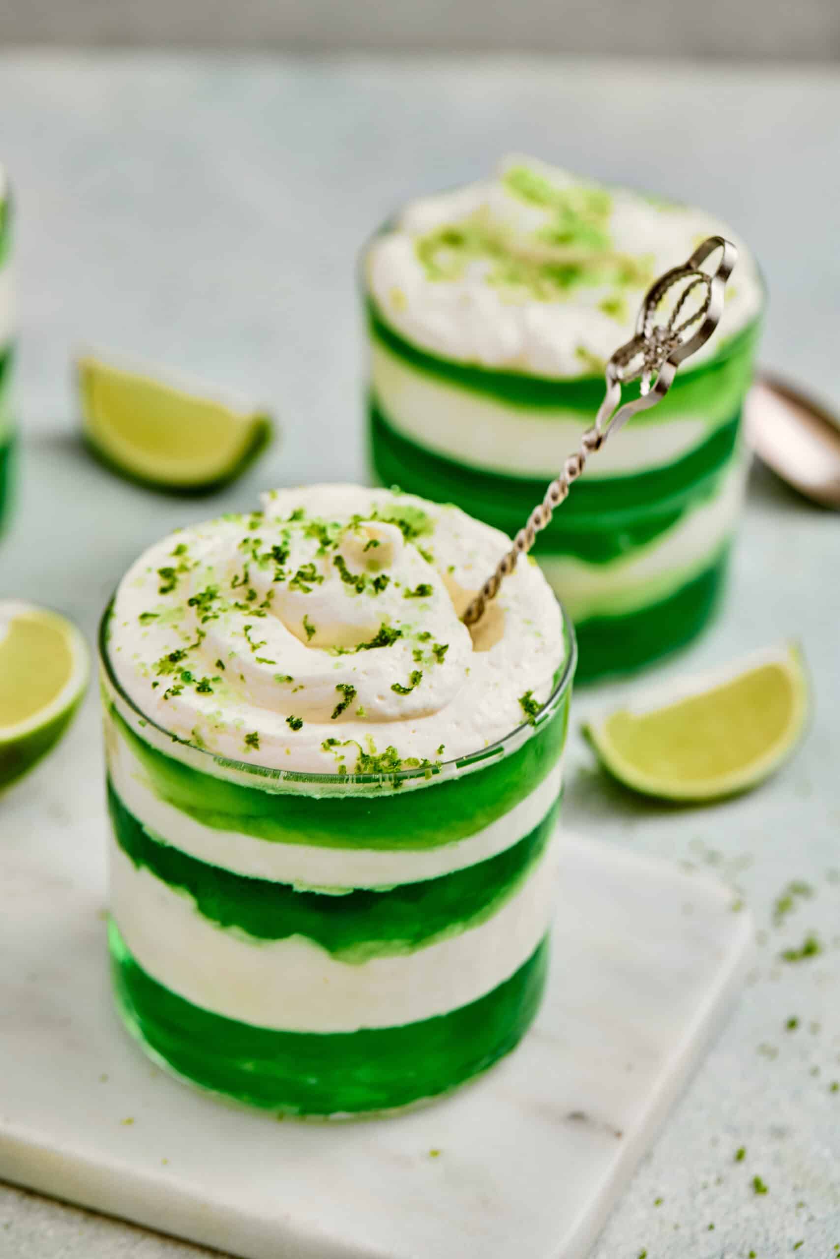 These striped green and white jello layers are giving major St. Paddy's vibes and they're surprisingly easy to make. They're fun, festive, and totally Insta-worthy with their clean lines and fresh lime garnish. Make them boozy with vodka or white rum for your party, keep them alcohol-free for a family-friendly version, or try using lime jello alternating with coconut cream layers for a tropical twist.