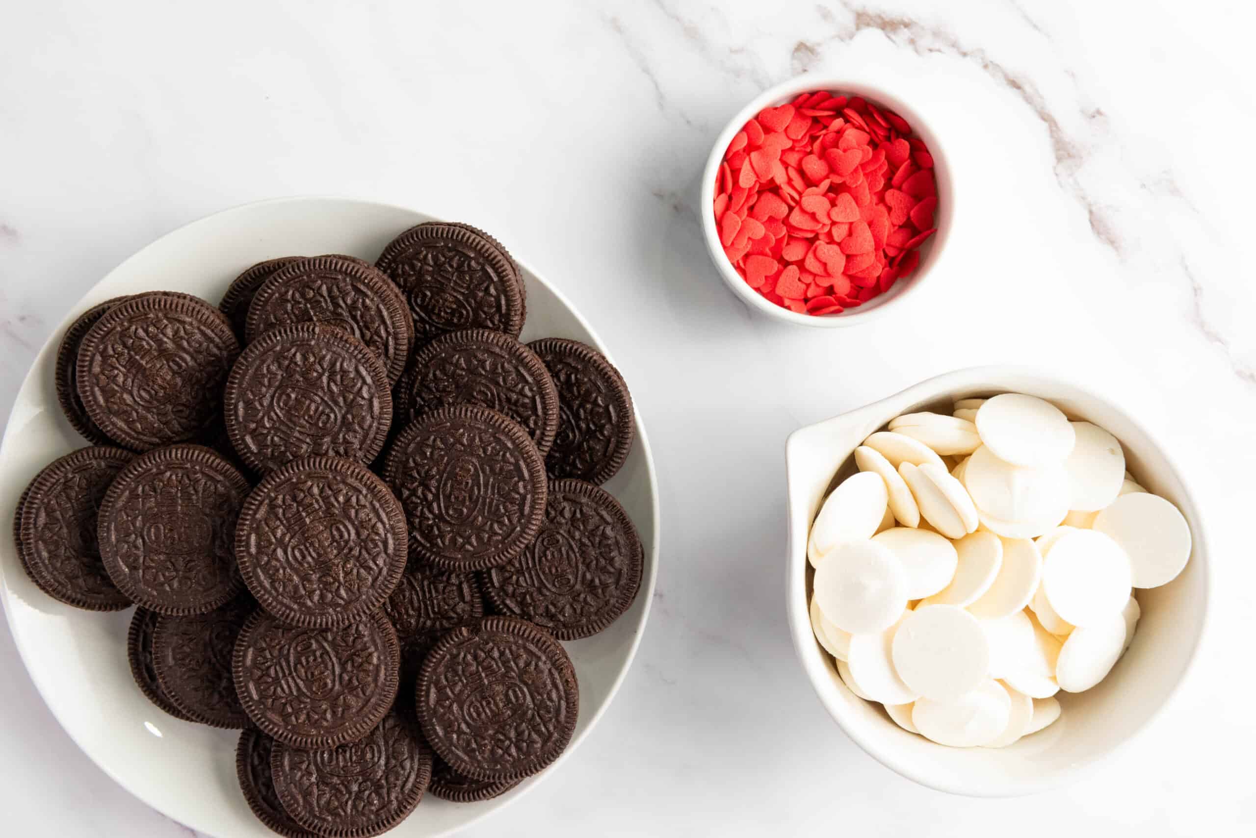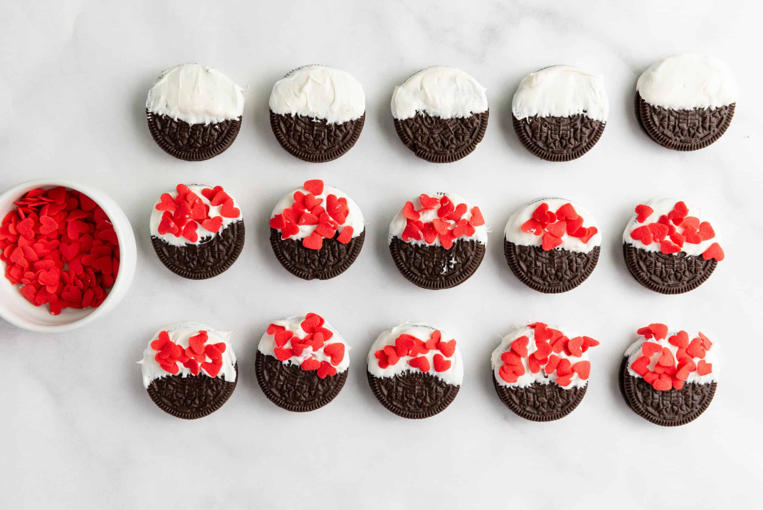 Step 4: While the candy coating is still wet, sprinkle heart sprinkles over the top of each Oreo so they stick.